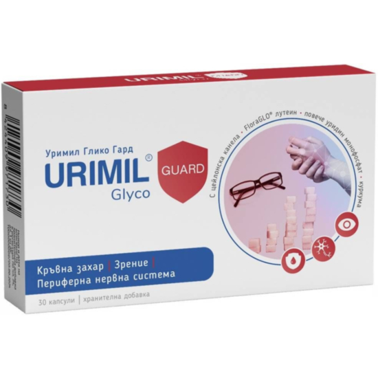Urimil Glyco Guard на Naturpharma е усъвършенствана формула, осигуряваща комплексна грижа за оптималните нива на кръвна захар, здравето на периферната нервна система и доброто зрение. С него получавате синергичния ефект на 16 активни съставки в оптимални дози. Така само с 1 капсула дневно успявате да задоволите нуждите си от редица хранителни микроелементи, подкрепени от ценни растителни екстракти и нуклеотиди.