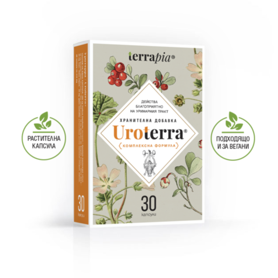 Uroterra / Уротерра – за лечение и профилактика на инфекции и при дискомфорт в уринарния тракт. Специално подбраните билкови екстракти са с доказана ефективност при лечение на цистит и инфекция на пикочните пътища. Уротерра облекчава симптомите на често уриниране, болка и парене. Подпомага изхвърлянето, възпрепятства размножаването и задържането на бактериите – основен причинител на уроинфекции. Високо съдържание на екстракт от червена боровинка.