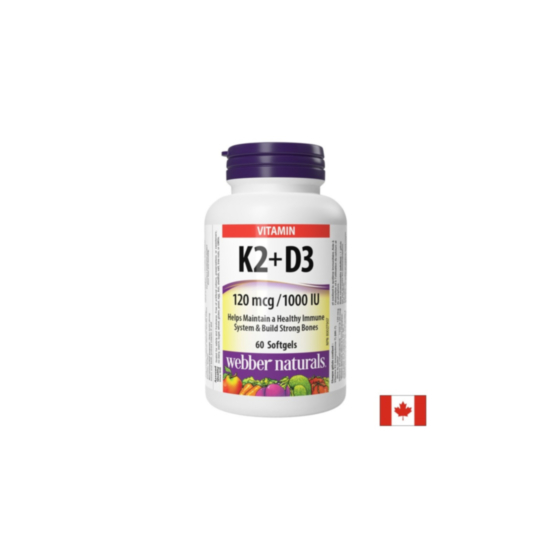Vitamin K2 120 mcg & D3 1000 IU на Webber Naturals съдържа К2 под формата на менахинон-7 (МК-7), получен при ферментацията на соеви зърна, от които се приготвя традиционната японска храна натто и D3 (холекалциферол). D3 (холекалциферол) е естествената, безопасна и биоактивна форма на витамин D. Комбинирането на витамин D3 и К2 спомага за по-доброто им усвояване, отколкото при индивидуален прием.