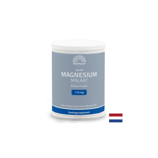 Магнезиевият малат е съединение, получено чрез комбиниране на магнезий с ябълчена киселина. Магнезиевият малат е с висока бионаличност и се усвоява по-добре от други магнезиеви продукти. Магнезият се използва за лечение на много различни състояния, като мигрена, хронична болка и депресия. Най-често се използва за подобряване на настроението, контрол на кръвната захар, справяне с умората и хроничната болка. Във формулата магнезиев малат на прах на Mattisson е включен и витамин В6 (пиродоксин), който има подобно на магнезия действие, що се отнася до снабдяването на мускулите с енергия и повишаването на физическата и психическата издръжливост. Пиродоксинът увеличава и абсорбцията на магнезия.