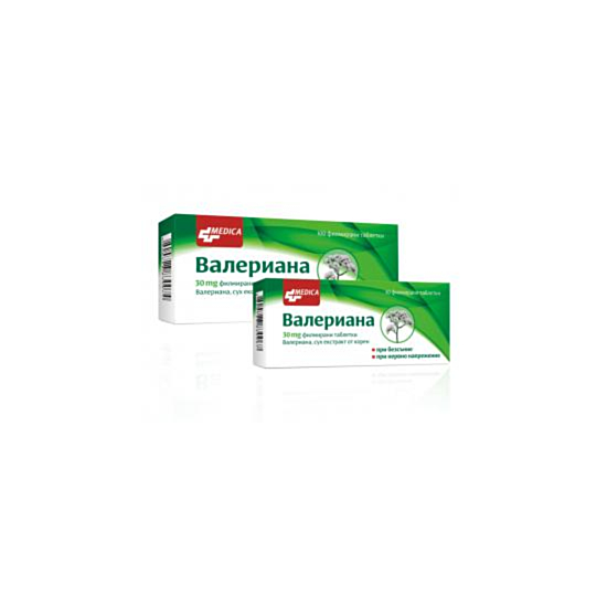 Валериана е висококачествено лекарствено средство без лекарско предписание, способстващо за спокойствие и по-добър сън. Валериана спомага за по-бързото заспиване, за по-здрав и спокоен сън. В същото време действа успокояващо, облекчава психическото напрежение и тревожността. Продуктът е подходящ при проблеми със съня, напрежение и стрес, раздразнителност и емоционална нестабилност. Успокоява превъзбудената нервна система. Формулата на продукта съдържа сух екстракт от корен на растението валериана. Този стандартизиран екстракт отговаря на всички европейски изисквания за лекарствен продукт – стандартизирането на екстракта гарантира постоянно качество на продукта и високо съдържание на активните съставки. За възрастни и деца над 12 години.