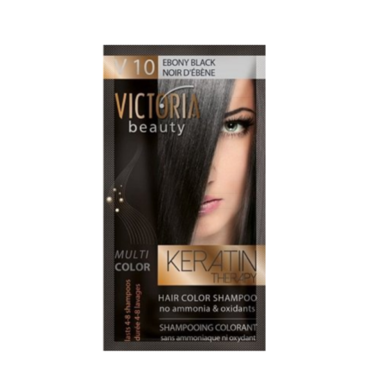 ВБ 77400 ОЦВЕТИТЕЛ №10 ЧЕРЕН 40МЛ - Шампоанът-оцветител 10 Черен на VICTORIA beauty е интензивен шампоан оцветител: покрива добре белите коси, не съдържа амоняк и има трайност от 4 до 8 седмици. Лесен за употреба, дерматологично тестван. След използването на шампоана косата придобива избрания цвят, като заедно с това е видимо по-жизнена и сияйна.
