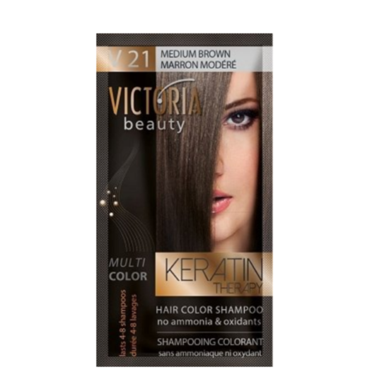 ВБ 77402 ОЦВЕТИТЕЛ №21 СРЕДНО КАФЯВ 40МЛ - Шампоанът-оцветител 21 Средно кафяв на VICTORIA beauty е интензивен шампоан оцветител: покрива добре белите коси, не съдържа амоняк и има трайност от 4 до 8 седмици. Лесен за употреба, дерматологично тестван. След използването на шампоана косата придобива избрания цвят, като заедно с това е видимо по-жизнена и сияйна.