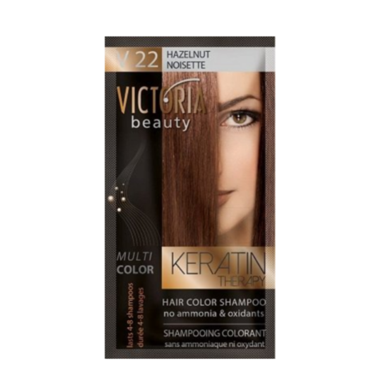 ВБ 77403 ОЦВЕТИТЕЛ №22 ЛЕШНИК 40МЛ - Шампоанът-оцветител 22 Лешник на VICTORIA beauty е интензивен шампоан оцветител: покрива добре белите коси, не съдържа амоняк и има трайност от 4 до 8 седмици. Лесен за употреба, дерматологично тестван. След използването на шампоана косата придобива избрания цвят, като заедно с това е видимо по-жизнена и сияйна.
