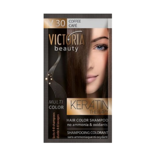 ВБ 77404 ОЦВЕТИТЕЛ №30 КАФЕ 40МЛ - Шампоанът-оцветител 30 Кафе на VICTORIA beauty е интензивен шампоан оцветител: покрива добре белите коси, не съдържа амоняк и има трайност от 4 до 8 седмици. Лесен за употреба, дерматологично тестван. След използването на шампоана косата придобива избрания цвят, като заедно с това е видимо по-жизнена и сияйна.