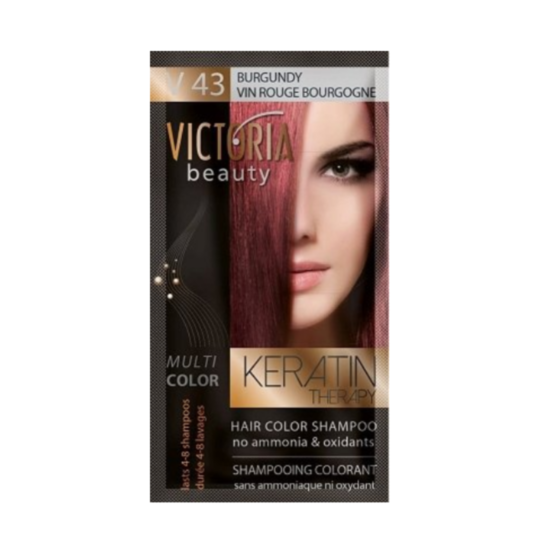 ВБ 77410 ОЦВЕТИТЕЛ №43 БУРГУНДИ 40МЛ - Шампоанът-оцветител 43 Бургунди на VICTORIA beauty е подходящ за средно кестенява до тъмно руса коса. Продуктът има щадящо действие, тъй като не съдържа амоняк. Покрива добре белите коси, като цветът издържа между 4-8 измивания. След използването на шампоана косата придобива избрания цвят, като заедно с това е видимо по-жизнена и сияйна.