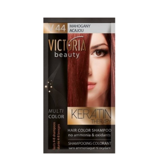 ВБ 77411 ОЦВЕТИТЕЛ №44 МАХАГОН 40МЛ - Шампоанът-оцветител 44 Махагон на VICTORIA beauty е интензивен шампоан оцветител: покрива добре белите коси, не съдържа амоняк и има трайност от 4 до 8 седмици. Лесен за употреба, дерматологично тестван. След използването на шампоана косата придобива избрания цвят, като заедно с това е видимо по-жизнена и сияйна.