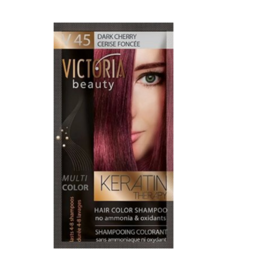 ВБ 77412 ОЦВЕТИТЕЛ №45 ТЪМНА ЧЕРЕША 40МЛ - Оцветяващият шампоан е с временно действие и е подходящ за руса до тъмно кестенява коса, в зависимост от избрания цвят. Формулата му е обогатена с кератин, който укрепва и заздравява косъма, стимулира растежа и го защитава от вредното въздействие на ултравиолетовите лъчи. Шампоанът прониква в дълбочина и действа благоприятно на косата, като същевременно покрива добре белите коси. Той не съдържа амоняк и е максимално щадящ косата, като заедно с това бързо и лесно помага за достигане на желания цвят. Деликатната му текстура го прави приятен за нанасяне и лесен за употреба. След използването на шампоана косата придобива избрания цвят, като заедно с това е видимо по-жизнена и сияйна. Цветът се задържа върху косата от 4 до 8 измивания, което зависи от времето на боядисване, указано в инструкциите.
