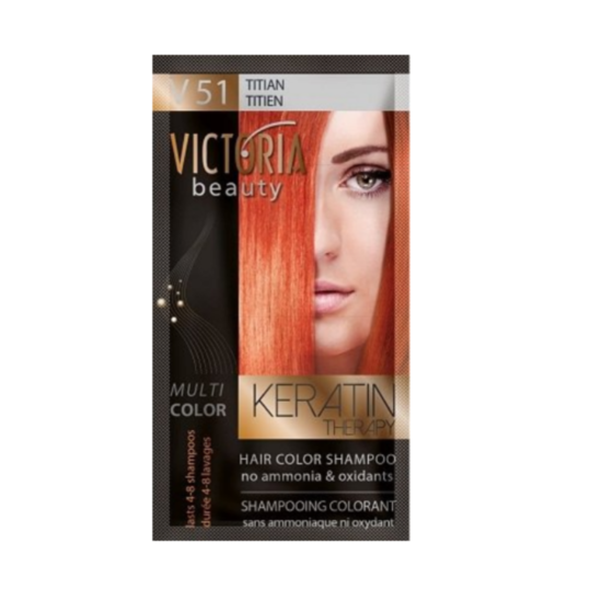 ВБ 77418 ОЦВЕТИТЕЛ №51 ТИЦИАН 40МЛ - Шампоанът-оцветител 51 Тициан на VICTORIA beauty е интензивен шампоан оцветител: покрива добре белите коси, не съдържа амоняк и има трайност от 4 до 8 седмици. Лесен за употреба, дерматологично тестван. След използването на шампоана косата придобива избрания цвят, като заедно с това е видимо по-жизнена и сияйна.