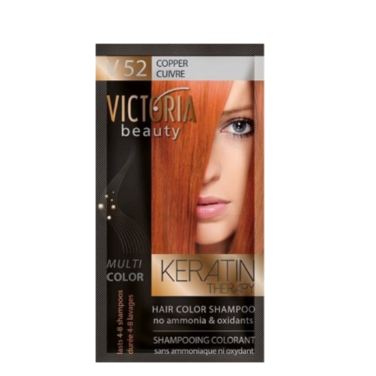 ВБ 77419 ОЦВЕТИТЕЛ №52 МЕД 40МЛ - Шампоанът-оцветител 52 Мед на VICTORIA beauty е интензивен шампоан оцветител: покрива добре белите коси, не съдържа амоняк и има трайност от 4 до 8 седмици. Лесен за употреба, дерматологично тестван. След използването на шампоана косата придобива избрания цвят, като заедно с това е видимо по-жизнена и сияйна.