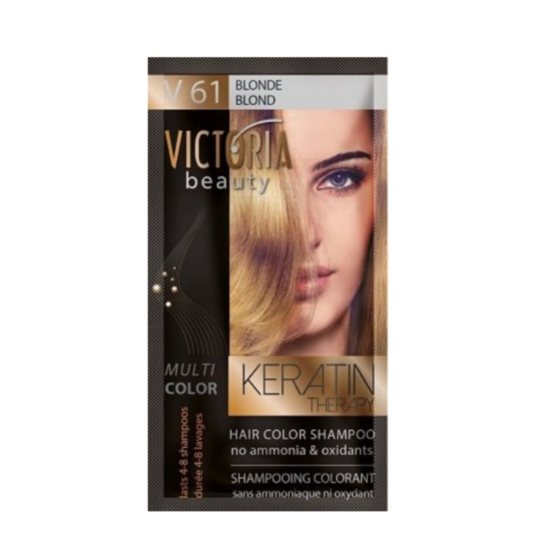 ВБ 77421 ОЦВЕТИТЕЛ №61 РУС 40МЛ Шампоанът-оцветител 61 Рус на VICTORIA beauty е подходящ за руса и светло руса коса. Продуктът има щадящо действие, тъй като не съдържа амоняк. Покрива добре белите коси, като цветът издържа между 4-8 измивания. След използването на шампоана косата придобива избрания цвят, като заедно с това е видимо по-жизнена и сияйна.