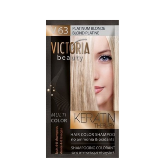 ВБ 77423 ОЦВЕТИТЕЛ №63 ПЛАТИНЕНО РУС 40МЛ - Шампоанът-оцветител 63 Платинено рус на VICTORIA beauty е интензивен шампоан оцветител: покрива добре белите коси, не съдържа амоняк и има трайност от 4 до 8 седмици. Лесен за употреба, дерматологично тестван. След използването на шампоана косата придобива избрания цвят, като заедно с това е видимо по-жизнена и сияйна.