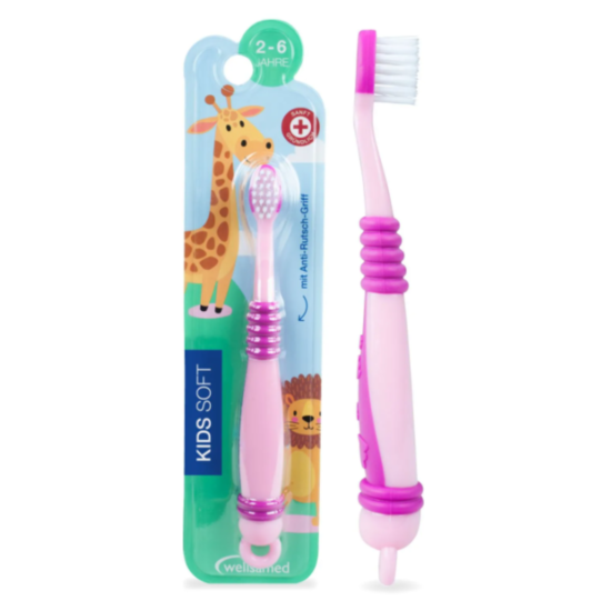 ВЕЛСАМЕД ЧЕТКА ЗА ЗЪБИ ЗА ДЕЦА СОФТ 2-6Г В е мека детска четка за зъби, подходяща за първата самостоятелна четка на детето. С изключително нежни косъмчета и овална малка глава. Ергономична форма на дръжката, завършваща със закачалка. Малката глава на четката, специално разработена за деца, почиства старателно дори труднодостъпни места в устната кухина. Четката за зъби е с цветен и забавен дизайн, което прави миенето на зъбите още по-забавно.
