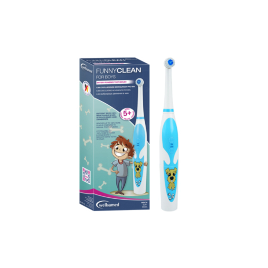 Електрическа четка Funny Clean Електрическа четка за зъби с батерии за деца. 100% нежно и ефективно премахва плаката. 8 800 въртящи движения в минута. Компактна глава, която обгръща детските зъбки за цялостно почистване за 3 минути. За момчета.