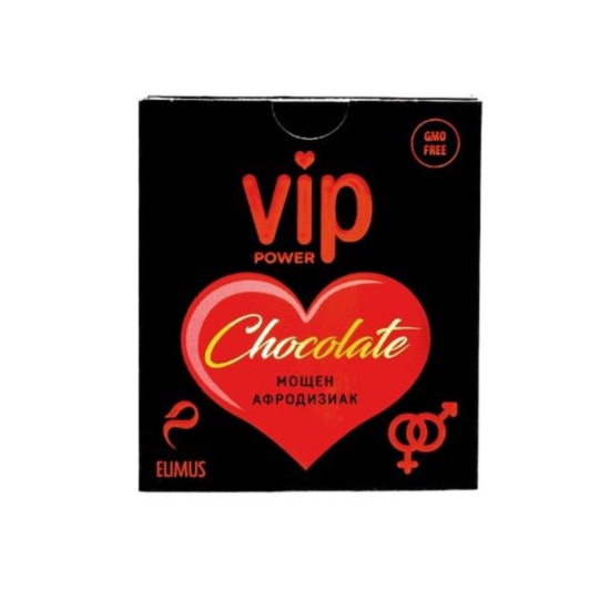 VIP Power Chocolate от Elimus е хранителна добавка с 54% черен шоколад за сексуална стимулация. VIP Шоколадово сърце е мощен афродизиак, напълно натурален сексуален стимулант, който представлява комбинация от натурални продукти и подбрани билки за подобряване на еректилната функция. Ефектът от приема на хранителната добавка VIP се състои в подпомагане на разширяването на кръвоносните съдове на пениса при мъжете, което повишава чувствителността и помага за получаване на ерекция при сексуална стимулация. При употреба от жени хранителната добавка VIP увеличава кръвотока на влагалището което улеснява сексуалната възбуда.