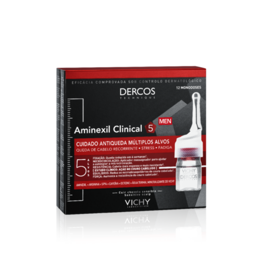 Vichy Dercos Aminexil Clinical 5 Hair Loss Treatment for Men представлява интензивна терапия против загуба на коса, която действа в 5 целенасочени действия и е предназначена за мъже с повтарящ се косопад. Ампулите против косопад на Виши от серията Деркос са истинска иновация, тъй като са съставени на базата на Aminexil Clinical 5 Complex, който е молекула против косопад с клинично доказана ефикасност и с 5 активни съставки, за по-добро подсилено действие. Aminexil действа от корена до върха, като засилва закрепването на косъма в кожата на главата и заздравява и подсилва фибрите му, за да се намали загубата на коса. Aminexil молекулата против косопад притежава ново действие, което укрепва скалпа, като намалява микро-дисбаланса и усилва устойчивостта му. Продуктът не съдържа парабени, има хипоалергенна формула, тествана под дерматологичен контрол в клинична среда и е много подходящ за чувствителен скалп. След 3 седмици употреба скалпът е подсилен, косопада е намален, а косата е по-здрава и устойчива.