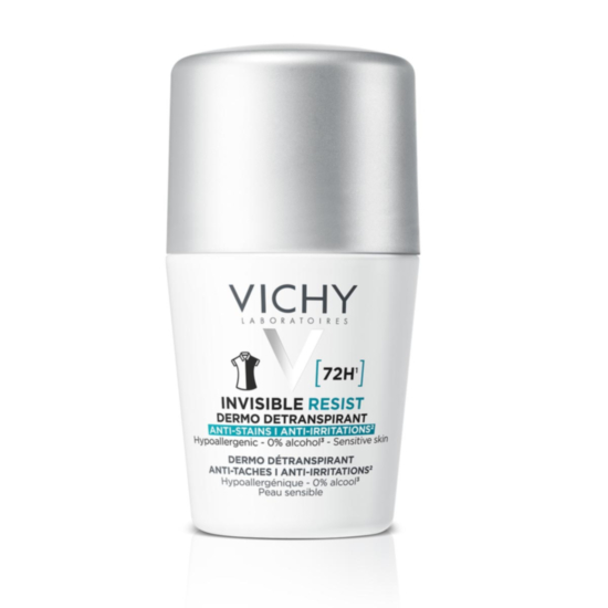 ВИШИ ДЕЗОДОРАНТ РОЛ-ОН ПРОТИВ ПЕТНА И РАЗДРАЗНЕНИЯ 72Ч 50МЛ Дезодорант рол-он с дълготраен антиперспириращ ефект при всякакви ситуации. Подходящ за чувствителна кожа. Виши Инвизибъл Резист Дермо 72ч. Дезодорант рол-он против петна и раздразнения има висока ефикасност и в продължение на 72 часа предпазва от неприятни миризми, а кожата остава суха. С формула, която предотвратява образуването на бели петна по тъмните дрехи и жълти петна при светлите дрехи, както и втвърдяването на тъканите на дрехите. Без парабени и алокохол. Дерматологично тестван продукт. Хипоалергенен.