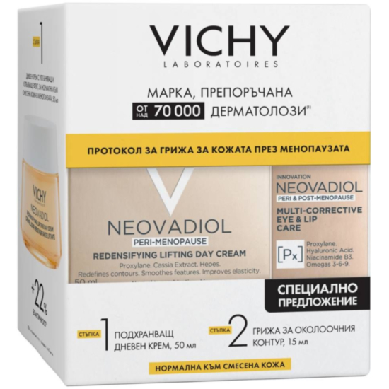 Комплектът Neovadiol на Vichy включва 2 страхотни продукта, които ще се погрижат за кожата на лицето в периода на перименопауза - дневен уплътняващ крем за нормална кожа и мултикоригиращ крем за очи и устни.