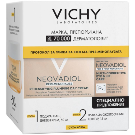 Комплектът Neovadiol на Vichy включва 2 страхотни продукта, които ще се погрижат за кожата на лицето в периода на перименопауза - дневен уплътняващ крем за суха кожа и мултикоригиращ крем за очи и устни.