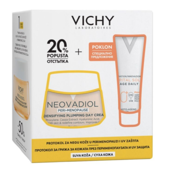 ВИШИ КОМПЛЕКТ НЕОВАДИОЛ ПЕРИ-МЕНОПАУЗА ДНЕВЕН КРЕМ ЗА СУХА КОЖА 50МЛ+SOLEIL SPF50+ UV-AGE ФЛУИД 15МЛ