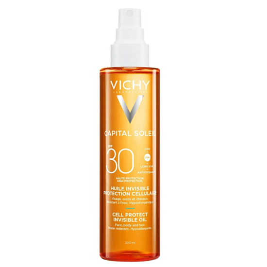 Маслото с невидимо покритие Capital Soleil Cell Protect на Vichy осигурява защита на клетъчно ниво на кожата с ултрасензорно усещане за сухо докосване, като е подходящо за лице, тяло и краищата на косата. То осигурява мощен щит срещу вредните лъчи на слънцето, като същевременно оставя кожата с усещане за мигновено подхранване, както и сияен вид.