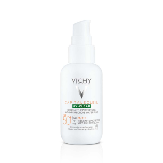 Слънцезащитният крем Vichy Capital Soleil UV-Clear SPF50+ Anti-Imperfections Fluid е с много висока UV защита. Лека, немазна флуидна текстура за ежедневна фотопротекция и грижа за кожата от факторите на експозома. Не оставя мазни следи. Тестван под офталмологичен контрол.