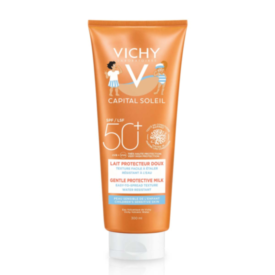 Слънцезащитното мляко за лице и тяло Виши е с много висок фактор на защита SPF50, специално предназначено за деца. Благодарение на формулата си с Mexoryl®-XL + МИНЕРАЛИ защитава детската кожа от вредното въздействие на UVA и UVB-лъчите и предпазва силно клетките. Предотвратява от преждевременно стареене на кожата, както и от появата на тъмни петна. Предпазва детската кожа за дълго. С хипоалергенна формула, без съдържание на парабени.