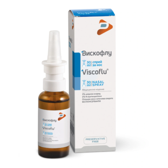 Вискофлу спрей за нос е медицинско изделие, съставено от 3% хипертоничен разтвор на натриев хлорид при контролирано pH и 6% N-ацетилцистеин. Показан е за улесняване на втечняването и механичното отстраняване на мукуса и/или мукопурулентния секрет, намиращ си в носната кухина (остър, подостър и ринит с бавно възстановяване; хроничен и муко-крустозен ринит; вазомоторен ринит) и в околоносните синуси (остър и хроничен синузит), като подобрява симптомите и хода на острото, подостро и хронично възпаление на горните дихателни пътища.