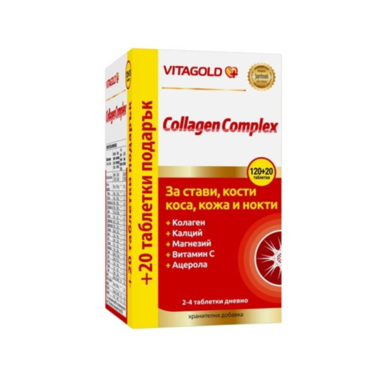 Колаген Комплекс е специална хранителна добавка, съдържаща мощен комплекс от колаген хидролизат, в комбинация с важните минерали магнезий и калций и мощният антиоксидант витамин C, която допринася за поддържането на здрави стави, кости, мускули, подкрепя мозъка и сърцето и подобрява състоянието на косата, кожата и ноктите. Колаген Комплекс съдържа и екстракт от ацерола, който подпомага синтеза на колаген в организма и действа като мощен антиоксидант. Активните съставки спомагат за правилното функциониране на опорно-двигателния апарат и съединителната тъкан, укрепва стените на кръвоносните съдове и скелетната мускулатура и допринася за поддържането на добро зрение.
