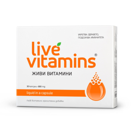 ДЕЙСТВИЕ: Live Vitamins® е балансирана формула от витамини и минерали, специално подбрани за поддържане здравето и нормалните функции на жизненоважни органи и системи в човешкото тяло. Комплексното действие на съставките в Live Vitamins® допринася за: • нормалната функция на имунната система с комплекса от желязо, мед, селен, витамин А, витамин D, витамин В6, витамин В12 и витамин С. Допринася за поддържане на нормалната функция на имунната система, като витамин С подкрепя функциите ú по време на интензивни физически упражнения и след това. • нормалната функция на сърдечно-съдовата система с комплекса от калций, желязо, витамин В1, витамин В2, витамин В6, витамин В12 и витамин С. Витамин В1 допринася за нормалната сърдечна функция, а калцият съдейства за нормалното кръвосъсирване. Витамин С допринася за нормалното образуване на колаген за нормалната функция на кръвоносните съдове (вените). Желязото и витамините В6 и В12 допринасят за нормалното образуване на червени кръвни телца и хемоглобин, а витамин В2 за поддържането на нормалното им състояние. • нормалното състояние на опорно-двигателния апарат с комплекса от калций, магнезий, цинк, манган, мед, витамин С и витамин D. Калцият е необходим за поддържане на нормалното състояние на костите, а магнезий, цинк, манган и витамин D допринасят за поддържането му. Витамин С е особено полезен, тъй като допринася за образуването на колаген за нормалната функция на костите. Манганът допринася и за нормалното образуване на съединителна тъкан (ценно за здравето на ставите), а медта за поддържането на нормалното състояние на съединителната тъкан. • добър тонус и енергия с енерджи комплекса от желязо, магнезий, витамин В2, витамин В6, витамин В12, витамин С. Всички съставки допринасят за намаляване на чувството на отпадналост и умора. Съдействат за нормалното протичане на метаболизма и производството на енергия. • нормалната когнитивна функция с комплекса от йод, желязо и цинк. Другият комплекс от биотин, мед, йод, магнезий, витамин В1, витамин В2, витамин В6, витамин В12 и витамин С допринася за нормалната функция на нервната система, като биотин, магнезий и витамините В1, В6, В12 и С също така подкрепят поддържането на нормалната психична функция. Това съдейства за нормалната функция на мозъка и паметта. • поддържане на красив външен вид с комплекса от коензим Q10, витамин А, витамин С, витамин Е, витамин В2, биотин, цинк, селен, йод, мед. Те допринасят за поддържането на нормалното състояние на кожата. Медта допринася за нормалната пигментация на кожата, а витамин С за нормалното образуване на колаген за нормалната функция на кожата. Биотин, селен и цинк допринасят за поддържане на нормалното състояние на косата, а селен и цинк за нормалното състояние на ноктите. Допълнителна подкрепа за красивия външен вид е и антиоксидантното действие на комплекса от мед, манган, селен, цинк и витамините В2, С и Е. • нормалното зрение с комплекс от цинк, биотин, витамин А и витамин В2. Цинкът заедно с витамините А и В2 допринасят за поддържането на нормално зрение. Тези два витамина плюс биотин подпомагат нормалното състояние на лигавиците. ТЕХНОЛОГИЯТА ЗА КАПСУЛИРАНЕ LICAPS™ Live Vitamins® е произведен във Франция по патентована технология LICAPS™ за влагане на течни екстракти в твърди желатинови капсули. При този процес се елиминира термичната обра