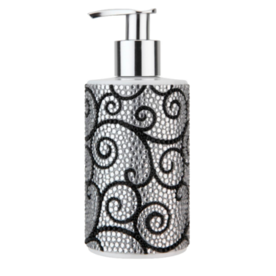 Декорацията от черни и бели кристали на диспенсъра добавя бляскав акцент към всяка баня и можете да го използвате многократно с предпочитан от Вас течен сапун.