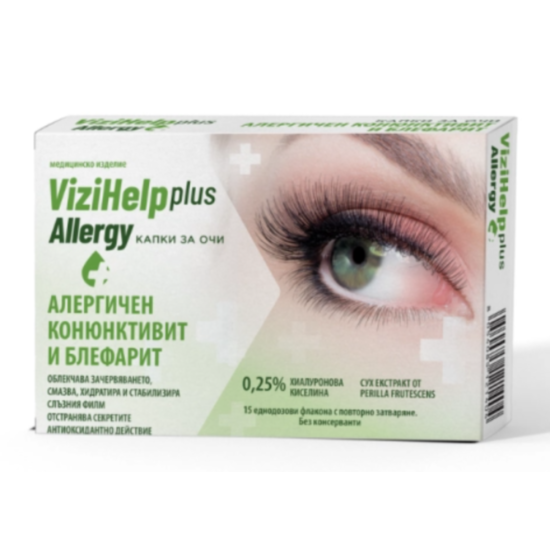 Визихелп Плюс Алерджи капки за очи облекчават симптомите на хроничен и алергичен конюнктивит и блефарит (сърбеж, зачервяване, сърбеж) и подпомагат отстраняването на секретите. Този стерилен хипотоничен разтвор със среден вискозитет благоприятства регенерацията – хидратира, стабилизира и възстановява водния слой на слъзния филм. Продуктът притежава антиоксидантно действие и облекчава очната умота (зрителен стрес), сухотата и усещането за чуждо тяло в очите. Може да се накапва преди поставяне на контактни лещи и по време на използването им за подобряване на поставянето и комфорта. Предназначен за деца над 3 години. Без консерванти. Предлага се в опаковка от 15 еднодозови флакона по 0,5 мл, които могат да се затварят и да се използват до 12 часа.