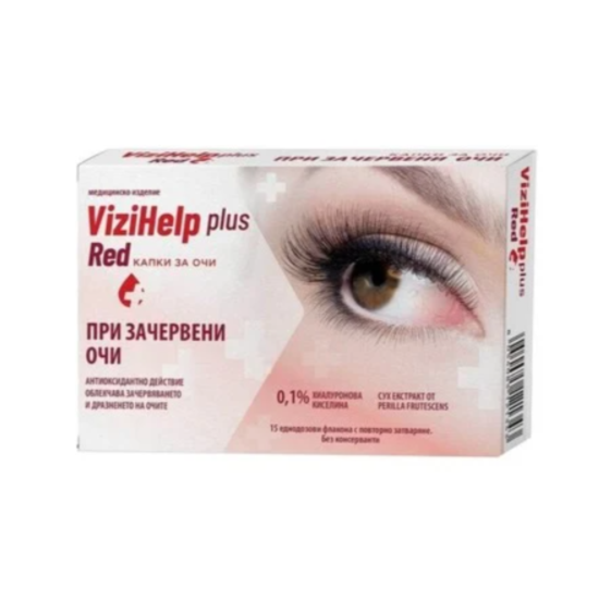 Визихелп Плюс Ред капки са подходящи за употреба при зачервени очи. Този изотоничен физиологичен разтвор с нисък вискозитет притежава антиоксидантно действие и облекчава зачервяването и раздразнението на очите в следствие на: атмосферни фактори (сух климат, вятър); фактори на околната среда; зрителен стрес, провокиран от прекомерна употреба на електронни устройства, носене на контактни лещи, интензивно учене, продължително шофиране и продължително излагане на слънце. Продуктът хидратира очите и възстановява слъзния филм. Може да се накапва преди поставяне на контактни лещи и по време на използването им за подобряване на поставянето и комфорта. Предназначен за деца над 3 години. Без консерванти. Предлага се в опаковка от 15 еднодозови флакона по 0,5 мл, които могат да се затварят и да се използват до 12 часа.