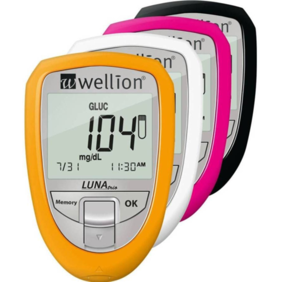WELLION ГЛЮКОМЕР ЛУНА ТРИО ГЛЮКОЗА + ХОЛЕСТЕРОЛ + ПИКОЧНА КИСЕЛИНА - Апаратът Luna Trio на Wellion предлага бързо и точно измерва на кръвна захар, холестерол и пикочна киселина. Той има удобен за ползване размер, ясен за отчитане екран и бутон за изхвърляне на използваната тест лента и противоплъзгащи крачета за повече устойчивост.