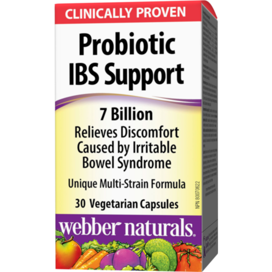 Пробиотик IBS Support на Webber Naturals е уникална формула с много щамове, клинично доказана, препоръчва се за облекчаване симптомоте на синдрома на раздразнените черва (IBS). Всяка вегетарианска капсула осигурява 7 милиарда активни клетки, съставени от патентовани щамове лактобацилус, бацили и ентерококи, за възстановяване и поддържане на чревната микрофлора и подпомагане на стомашно-чревното здраве.