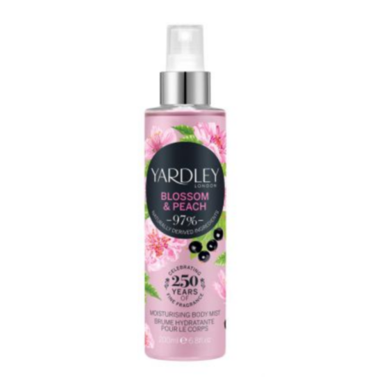 ЯРДЛИ ЧЕРЕШОВ ЦВЯТ И ПРАСКОВА МИСТ 200МЛ е дълготраен, бързо съхнещ мист за тяло, съдържащ сладко Бадемово масло, олио от Гроздови семки, Глицерин и Витамин Е. Не оставя петна. Комбинация от плодов и пикантно цветен аромат с нотки на Цитрус и Касис, съчетани с женствен Черешов цвят и Розов пипер във върховите нотки, вплетени в цветна сърцевина от Роза, Праскова и Люляк и база от Пачули и Мускус. 97% натурални съставки и алкохол на растителна основа.