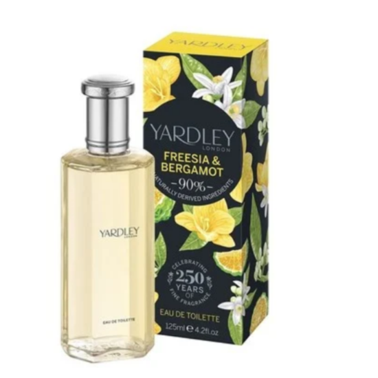 ЯРДЛИ ТОАЛЕТНА ВОДА ФРЕЗИЯ И БЕРГАМОТ 125МЛ - Тоалетната вода Ярдли е с лек цитросов флорален аромат с върхови нотки на бергамот, лимон, мандарина и кипарис. Сърцевината съчетава фрезия, момина сълза, джинджифил и пипер, подсилени чувствена основа от сандалово дърво, мускус и кехлибар. Освежаващ цветен аромат за всеки ден. Предлага се в опаковка от 125 мл.