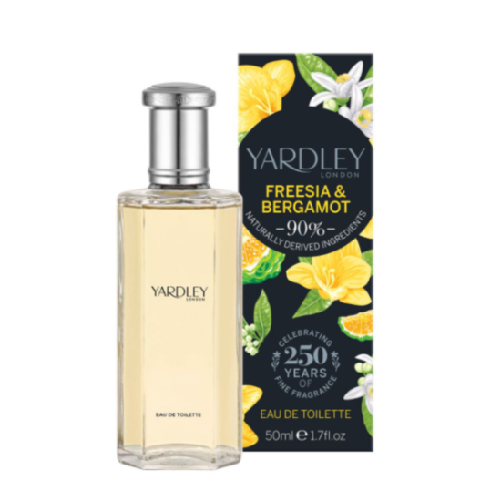 ЯРДЛИ ТОАЛЕТНА ВОДА ФРЕЗИЯ И БЕРГАМОТ 50 МЛ е тоалетна вода със свеж, лек цитрусово флорален аромат с енергизиращи върхови нотки на Бергамот, Лимон и Мандарина, следвани от ароматна цветна сърцевина, която комбинира Фрезия, Момина сълза, Джинджифил и Пипер, съчетани с топла, чувствена база от Сандалово дърво, Мускус и Амбър. Предлага се в опаковка от 50мл.