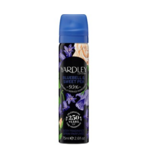 ЯРДЛИ ЗЮМБЮЛ И СЛАДЪК ГРАХ ДЕО СПРЕЙ 75МЛ - Създаден с изискан флорален аромат, дезодорантът Ярдли от серия Зюмбюл и Сладък грах нежно съчетава върхови нотки на освежаващ Бергамот, Лимон и Касис, чувствена сърцевина от Зюмбюл, Жасмин, Роза, Момина сълза и Божур с акцент от Сладък грах, на база от дървесни нотки, Ванилия и Мускус. Има дълготраен аромат в удобен размер за дамска чанта. Съдържа 95% натурални съставки. Без парабени. Подходящ за вегани. Предлага се в опаковка от 75 мл.
