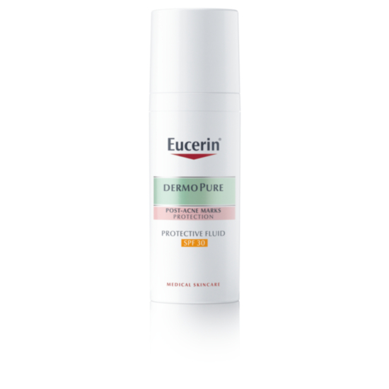 ДермоПюр е матиращ флуид с тройно действие от Юсерин, подходящ за кожа, склонна към акне и потъмняване на петната от акне. Редуцира съществуващите несъвършенства и предпазва кожата от появата на нови. С SPF30 UVA/B филтри, които защитават от потъмняване на петната (постинфламаторни хиперпигментации). Включва антибактериален декандиол срещу образуване на пъпки и Licochalcone за облекчаване на кожните раздразнения. Разработен с помощта на себум-регулиращата технология с дълготрайно усещане за сухота и матиран завършек. Некомедогенен, без омазняващ ефект. Клинично и дерматологично тестван.