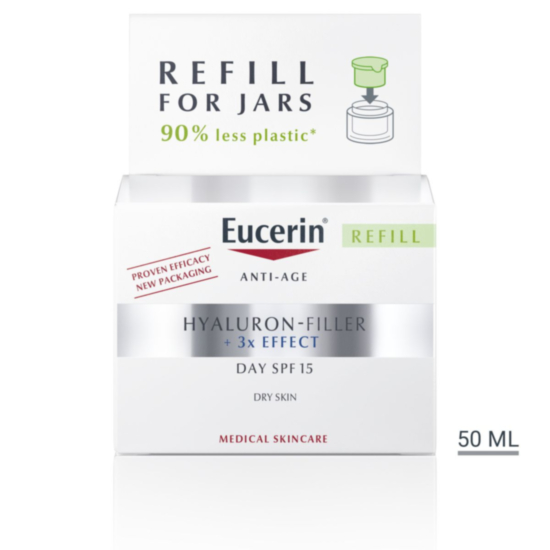 Eucerin Hyaluron-Filler Day Cream SPF 15 for Dry Skin е подходящ за суха кожа. Ефективен дневен крем, който запълва дори най-дълбоките бръчки и осигурява UVA и UVB защита. Формулата съдържа иновативната комбинация на Eucerin от хиалуронова киселина с високо и ниско молекулярно тегло и глицин-сапонин, която прониква в дълбочина в кожата, интензивно хидратира, видимо запълва всички бръчки и подмладява вида на кожата. ЮСЕРИН ХИАЛУРОН ФИЛЪР ДНЕВЕН КРЕМ ЗА СУХА КОЖА SPF 15 50МЛ ПЪЛНИТЕЛ и UVA филтър предлага ефективна защита от вредните слънчеви лъчи, преждевременното стареене на кожата и задълбочаването на бръчките. След употреба кожата изглежда значително по-млада, по-гладка и с изравнен тен. Кремът има немазна структура и осигурява отлична основа за фон дьо тен (ако е необходимо допълнително покритие) и друг грим. Има лек аромат. Без парабени. Дерматологично тестван продукт. Некомедогенен.